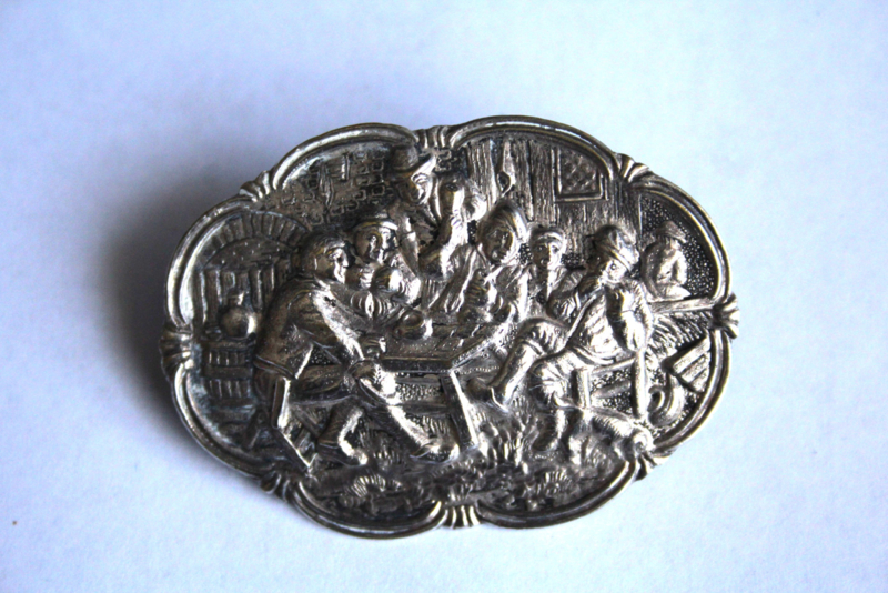 verzilverde broche - oud Hollandse café voorstellingVerzilverde broche met een café voorstelling