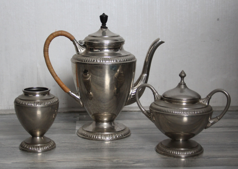 Art Deco verzilverde theeset met Theekan, suikerpot en lepelvaasje