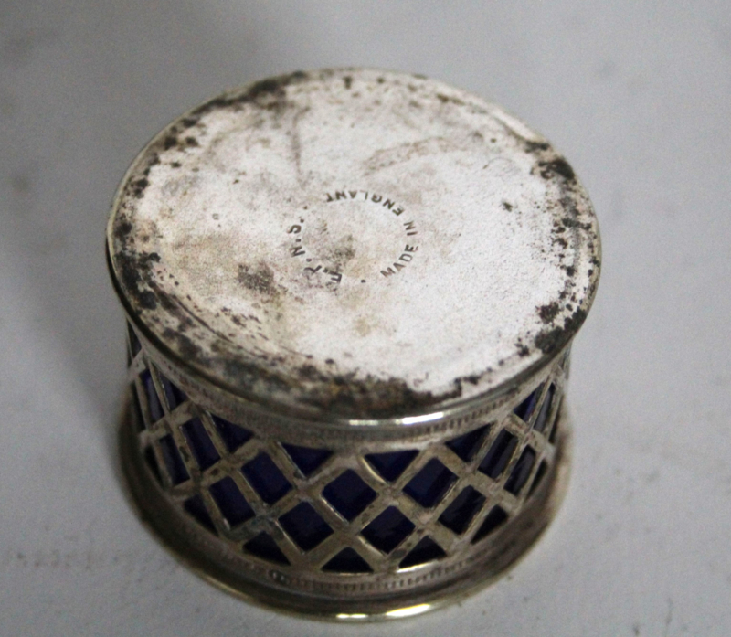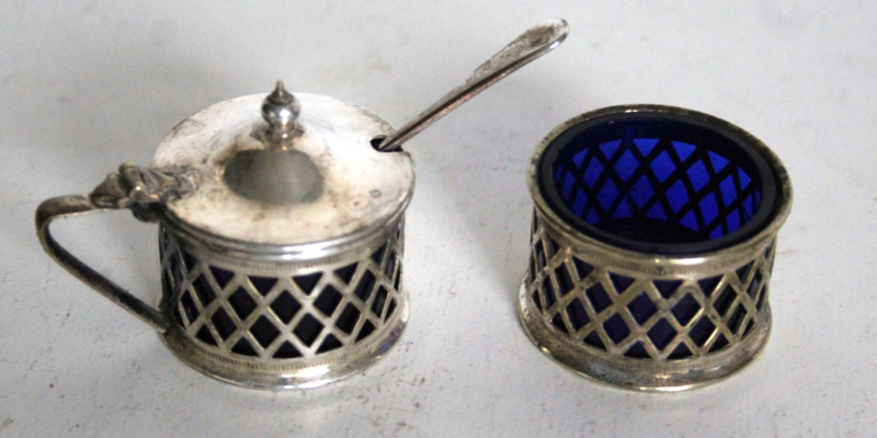 Verzilverd mosterd en zoutstel met blauwglazen liners